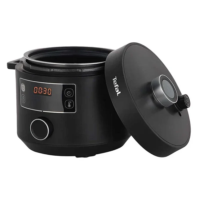 زودپز برقی تفال مدل CY 754830 با توان 1090 وات و ظرفیت 5 لیتر، یک دستگاه همه‌کاره برای پخت سریع، سالم و خوش‌طعم است. دارای 10 برنامه پخت از پیش تعیین‌شده، تایمر، خاموشی خودکار و قابلیت شروع با تأخیر تا 12 ساعت است. دیگ نچسب سه‌لایه و بدنه استیل ضدزنگ، دوام بالا و تمیزکاری آسان را تضمین می‌کنند.